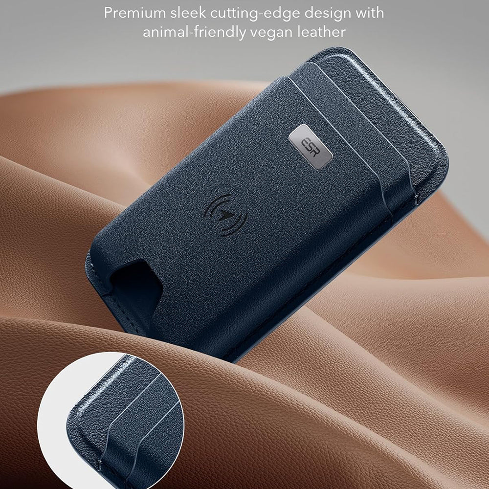 The wallet is designed with strong magnets for a secure attachment. Additionally, it is perfectly compatible with MagSafe technology. You can't lose it The new wallet from ESR features the "Find My" function. This is certified by Apple. The app shows the exact location of the wallet. Premium look and ample space This wallet has an elegant design. It can also store up to 5 cards, thanks to its 2 generous compartments. Specifications: Material: faux leather; Charging time: 1.5 hours; Usage time: 5 months; Dimensions: 115 x 96 x 66mm; Weight: 80g; Compatibility: iPhone series 12 / 13 / 14 / 15 / 16 with MagSafe, official MagSafe cases, ESR HaloLock cases, ESR HaloLock Universal Ring. Attention! Not compatible with iPhone 12 mini / iPhone 13.